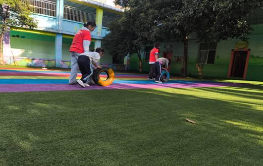 大学生志愿者们在机构老师的指导下,开展一对一的陪伴关爱活动。志愿者牵着孩子们的手做户外活动,扶着孩子们的背部走直线,陪伴患儿荡秋千、跳舞,全身心投入到与孩子们的游戏中。