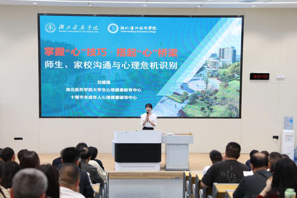 本网讯(通讯员刘媛媛)4月10日下午,我校大学生心理健康教育中心刘媛媛老师应邀赴汉江技师学院开展心理健康知识讲座,该校党委委员、副校长陈俊红、200余名班主任及相关教师参加。