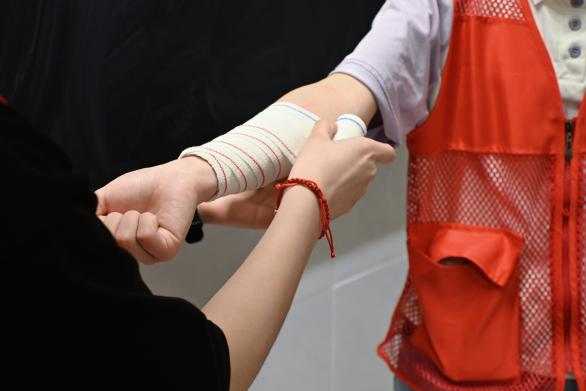 随后,杨梦娜通过实际演示,为同学们展示了手部常用的几种基础包扎方法:螺旋包扎法、八字包扎法以及回旋包扎法。每一种方法都有其独特的应用场景与技巧,而杨老师则用浅显易懂的方式将复杂的专业知识化繁为简。为了让孩子们更好地掌握要领,她还邀请了几位同学上台进行模拟演练。在服务队队员耐心细致的指导下,这些小“急救员”们一边尝试自己动手包扎,一边不断调整手法,力求做到规范准确。从最初的笨拙到逐渐熟练,他们的进步让在场的所有人都倍感欣慰。