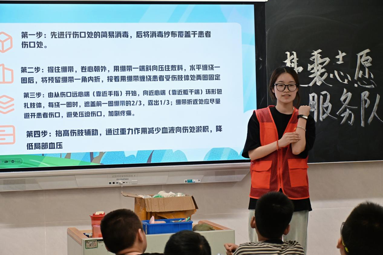 课程伊始,市未成年人心理健康辅导中心楚囊志愿服务队队员杨梦娜向同学们讲解了包扎的重要性和基本原则。她告诉孩子们,包扎不仅仅是为了固定和保护受伤部位,更是一种急救手段,能够有效控制出血、减轻疼痛,并防止伤势进一步恶化。这些看似简单的操作,在关键时刻却可能挽救一条生命。孩子们听得聚精会神,仿佛每一个字都敲开了他们对急救知识的新认知大门。
