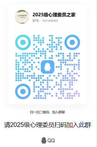 班级心理委员原则上是每个班级男女各1名,若班级规模确实较小或性别比例差距较大,可设1名(男女不限)。选拔出的心理委员请扫码加入2025级心理委员之家QQ群(群号1041600495)。宿舍心情联络员每宿舍设一名,可由宿舍长兼任,也可专人,列为宿舍长系列,宿舍心情联络员无需加入上述QQ群。各班级、宿舍采取学生自由报名和辅导员推荐相结合的形式,选出本班心理委员和宿舍心情联络员。