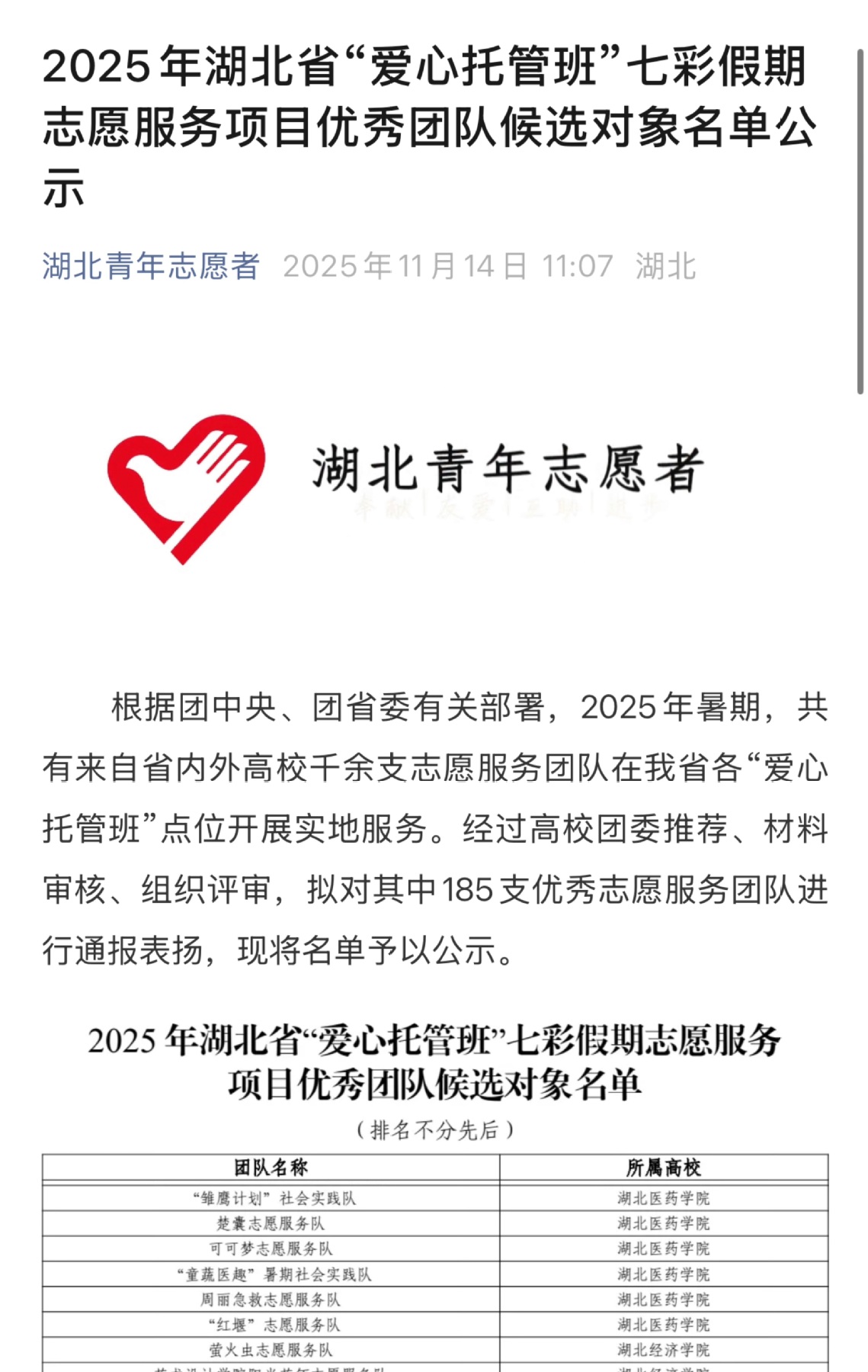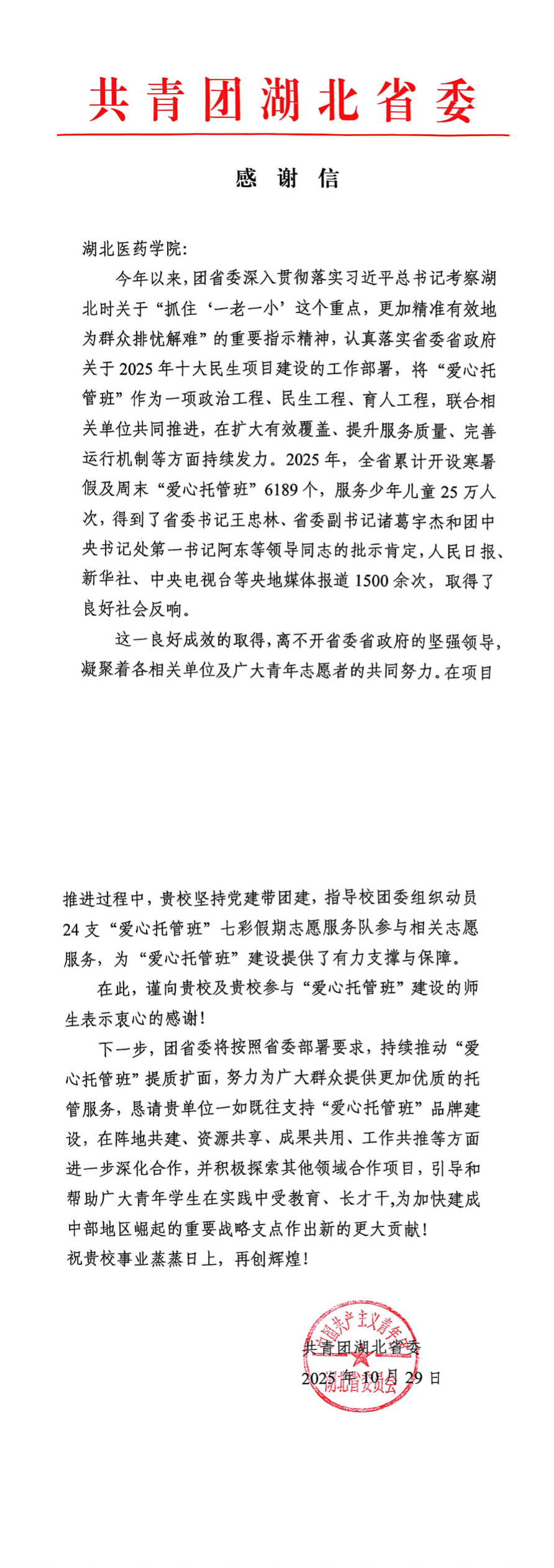 本网讯(通讯员 钟骅 江月宁)近期,共青团湖北省委向湖北医药学院发来感谢信,充分肯定我校在2025年湖北省“爱心托管班”七彩假期志愿服务项目建设中的积极贡献。同时,“雏鹰计划”社会实践队、楚囊志愿服务队、可可梦志愿服务队、“童蔬医趣”暑期社会实践队、周丽急救志愿服务队、“红堰”社会实践队等6支队伍荣获2025年湖北省“爱心托管班”七彩假期志愿服务项目优秀团队。