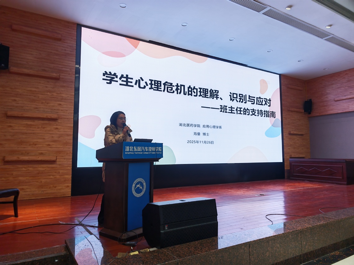 本网讯(通讯员 海曼)11月27日,应湖北东风汽车技师学院邀请,市未成年人心理健康辅导中心海曼老师为该校全体班主任作了题为《学生心理危机的理解、识别与应对》的专题讲座。此次讲座旨在提升一线教育工作者对学生心理危机的干预能力,共同守护学生心理健康成长。