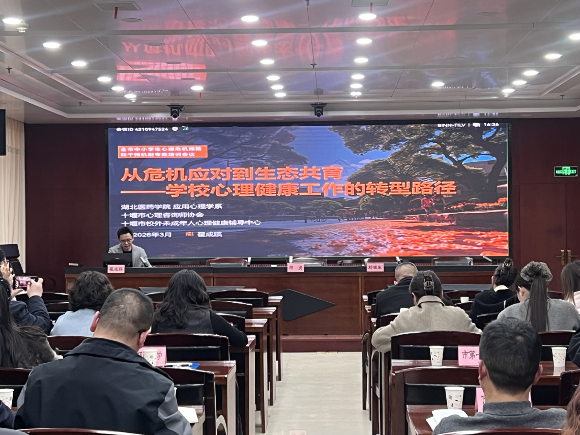 本网讯(通讯员 黄欣)为进一步健全全市中小学生心理危机预防和干预机制,提升心理健康教育工作的系统性与实效性,3月20日下午,十堰市教育局以“线上+线下”形式组织召开全市中小学生心理危机预防和干预机制专题培训会议。十堰市校外未成年人心理健康辅导中心专家、湖北医药学院马克思主义学院应用心理学系副教授、心理学博士翟成蹊受邀担任主讲专家并作专题授课。